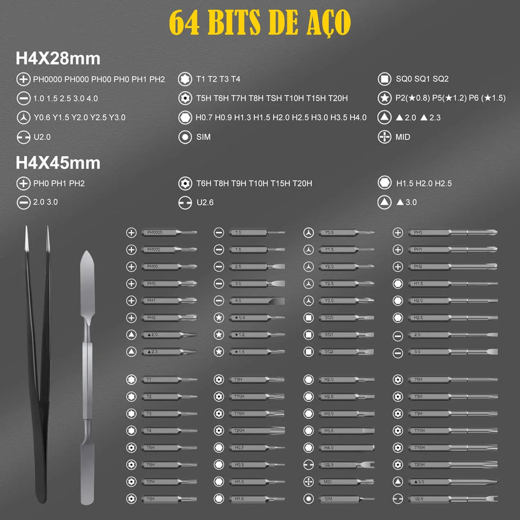 Inclui 64 pontas magnéticas diferentes em aço resistente — perfeitas para eletrônicos, notebooks, celulares, drones, câmeras, relógios e muito mais!